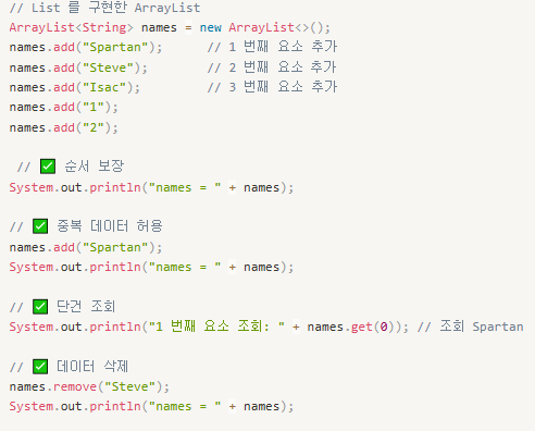 - ArrayList 는 요소의 순서를 유지하고 중복된 값을 저장할 수 있는 자료구조입니다.