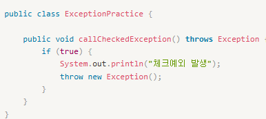 - 반드시 `try-catch`로 예외를 처리하거나 `throw` 키워드로 사용