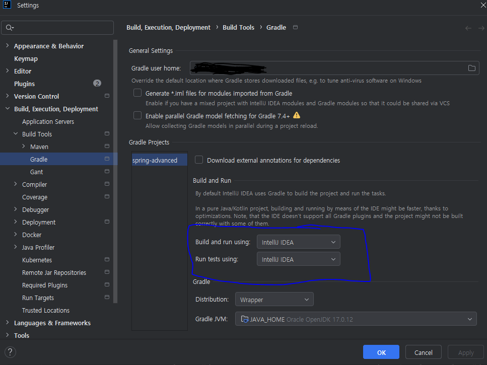 설정 에서 Build -> Build Tools -> Gradle 에 들어가서 그림에 파란 박스 안에 설정을 intellij IDEA로 변경해주었습니다.