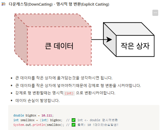 - 다운캐스팅 ( 큰 데이터를 작은 상자안에 넣는 개념)