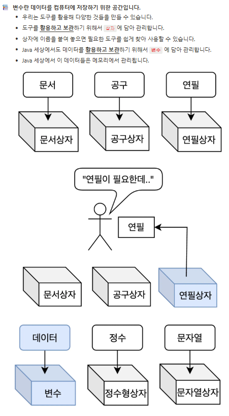 - 우리는 도구를 활용할 때 상자 (변수)에 담아 놓고 활용함.